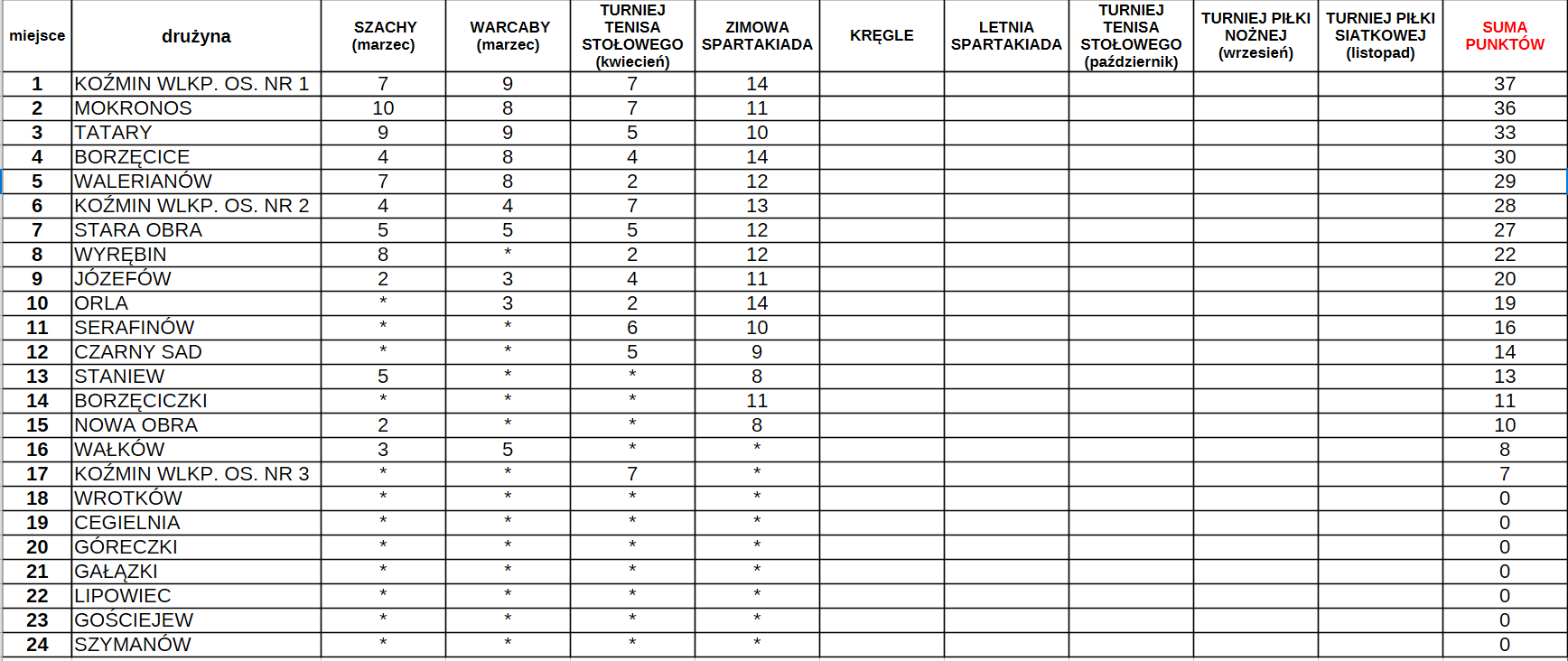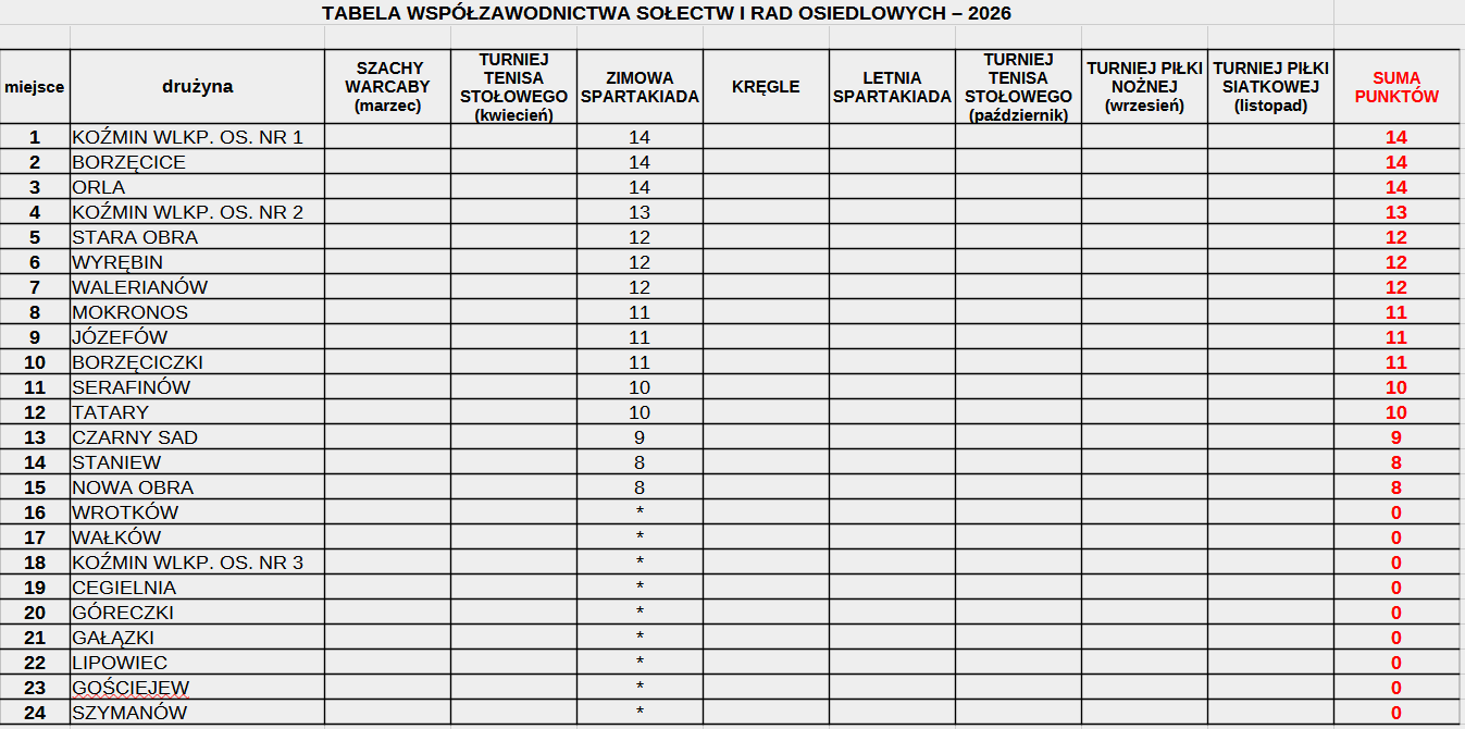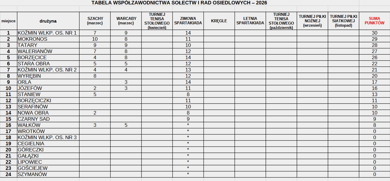 Tabela Współzawodnictwo Sportowe MiG Koźmin Wlkp TABELA WSPÓŁZAWODNICTWA SPORTOWEGOMIESZKAŃCÓW MIASTA I GMINY KOŹMIN WLKP. 2026